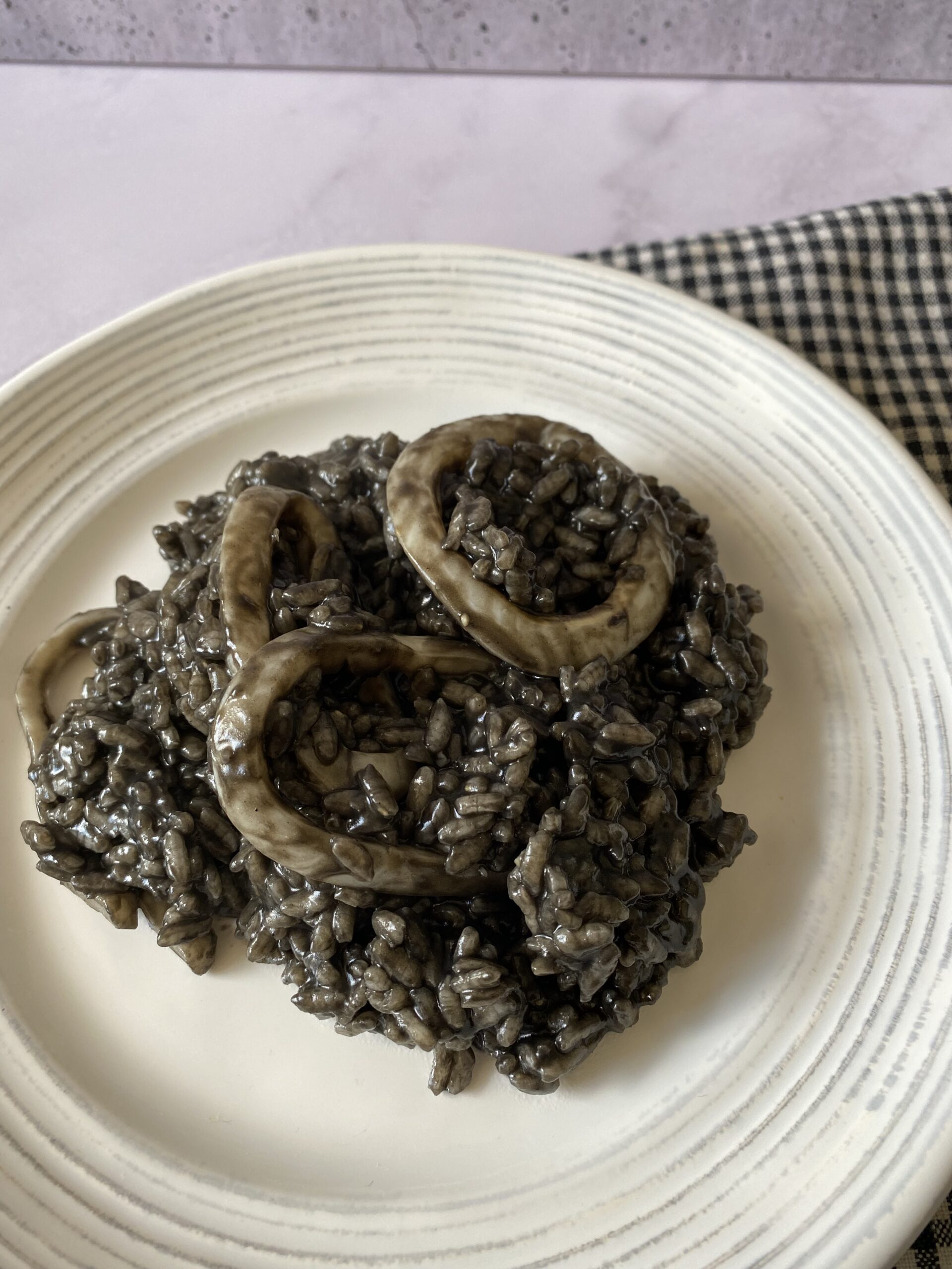• En la ultima parte del caldo, agregamos los aros de calamar descongelados, revolvemos y en cuanto el liquido haya sido absorbido, ya esta nuestro risotto